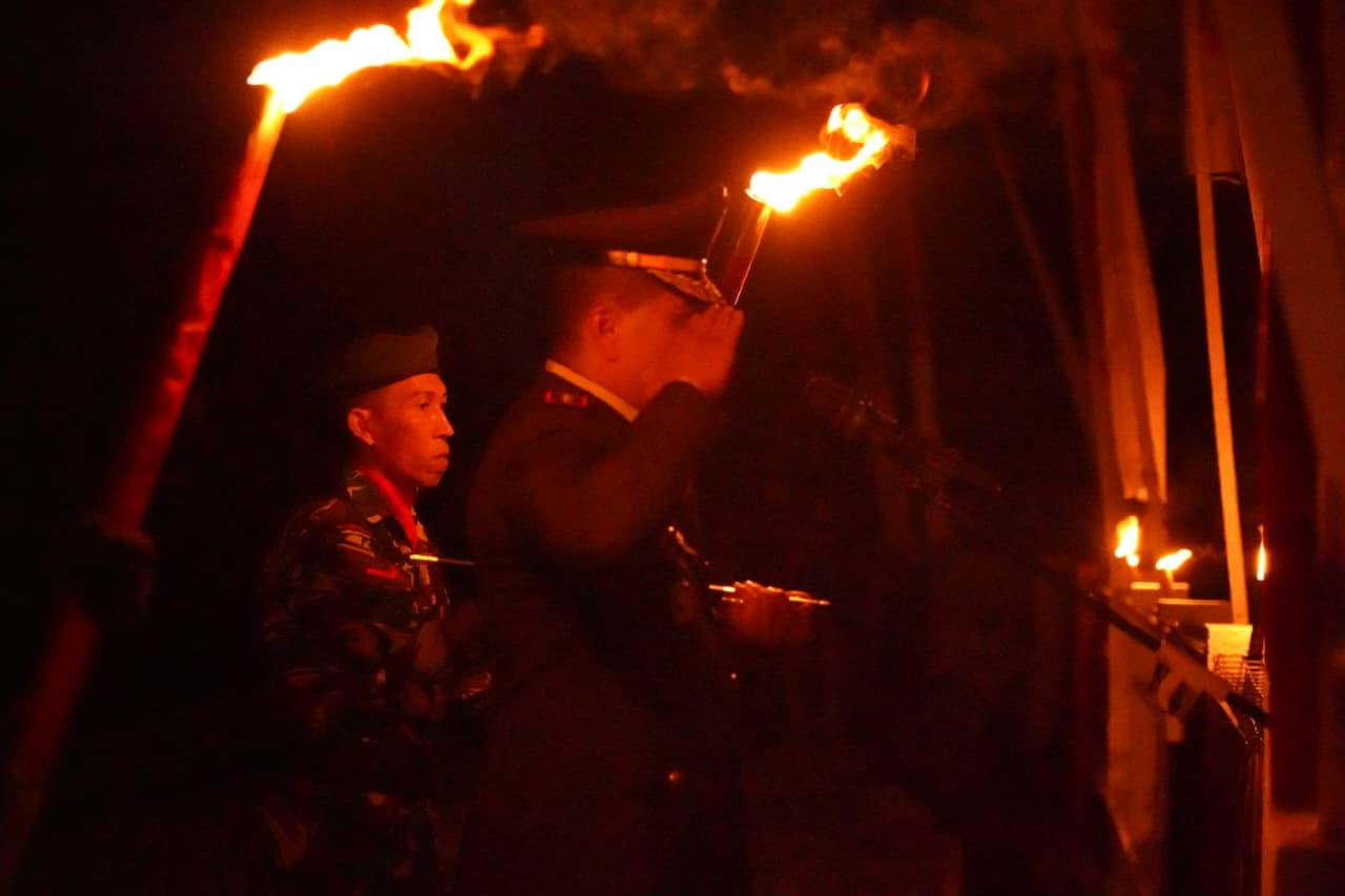 Kegiatan tersebut berlangsung khidmat di tengah malam, diiringi dentuman drum dan bunyi terompet yang dimainkan oleh Korps Musik (Korsik) Komando Resor Militer 012/TU. Suasana juga diterangi oleh obor bambu yang memberikan cahaya remang.