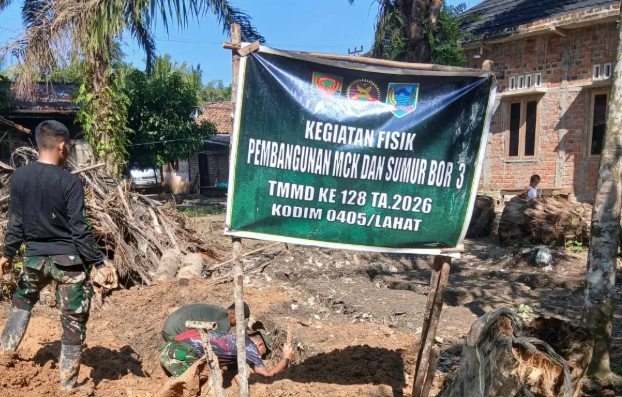 Lahat — Satgas TNI Manunggal Membangun Desa (TMMD) ke-128 Kodim 0405/Lahat menunjukkan komitmen luar biasa dengan mengedepankan gerak cepat (gercep) dalam menyediakan fasilitas bagi masyarakat. Setelah berhasil menemukan sumber air bersih dengan melakukan pengeboran, mereka segera melanjutkan dengan pembangunan mandi, cuci, kakus (MCK) di Desa Lubuk Tampang, Kecamatan Kikim Timur, Kabupaten Lahat.