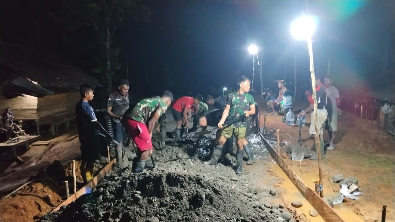 Penerangan lampu seadanya tak menyurutkan langkah para personel Satgas yang bekerja secara bergantian dalam shift malam. Dengan cangkul dan ember di tangan, adukan semen terus dituang dan diratakan ke badan jalan yang menjadi akses utama warga.