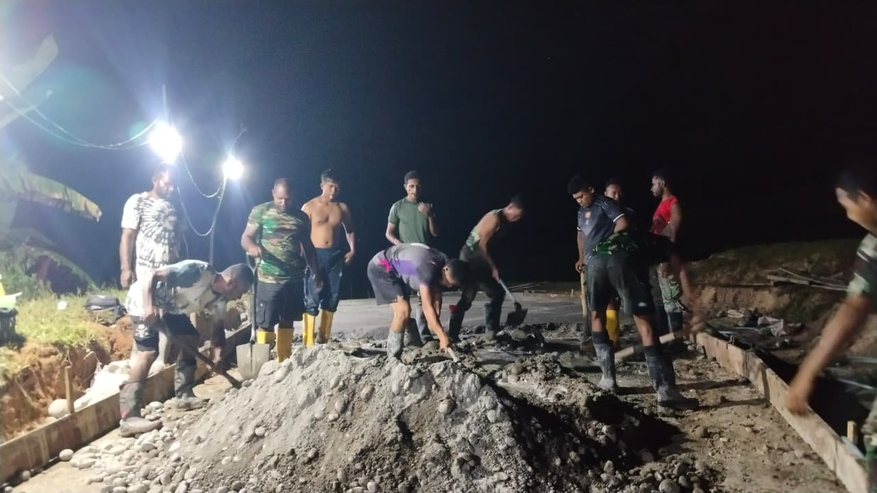 Dengan penerangan sederhana, suara alat kerja, arahan komando, dan tawa warga terdengar berpadu di lokasi. Pengerjaan dilakukan tanpa keluhan, menunjukkan kuatnya kebersamaan dan komitmen untuk menuntaskan pembangunan sesuai waktu yang telah ditetapkan.