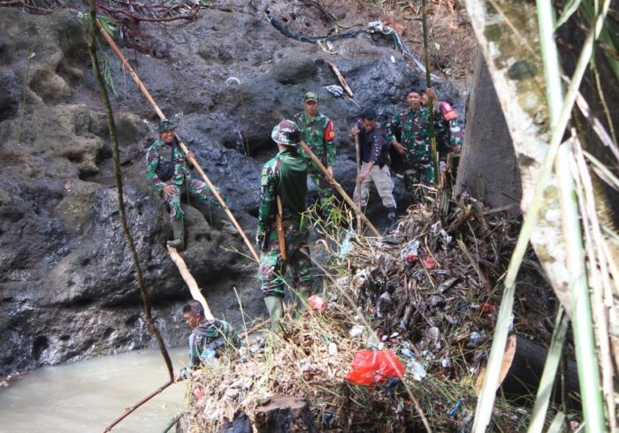 Personel Satgas dan warga Desa Naekasa bahu-membahu mengambil air dari sumber terdekat untuk menunjang kegiatan pengecoran dan pencampuran material konstruksi. Tanpa suplai air yang cukup, pembangunan tembok penahan jalan akan terhambat, mengingat proses pengecoran harus dilakukan secara kontinu.