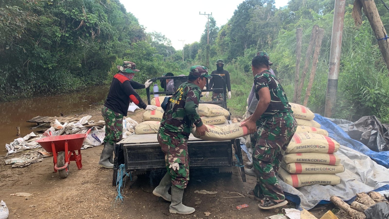Material pengecoran seperti semen dan pasir diangkut dari lokasi penyimpanan menuju area pengecoran secara manual maupun dengan bantuan alat sederhana. Sinergi antara tentara dan masyarakat membuat pekerjaan lebih ringan dan efisien.