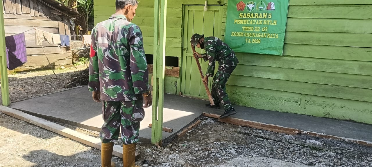NAGAN RAYA – Perlahan namun pasti, proses perehaban Rumah Tidak Layak Huni (RTLH) dalam program TMMD Ke-127 Kodim 0116/Nagan Raya mulai menunjukkan hasil nyata. Teras rumah yang sebelumnya masih tertutup papan cor, kini mulai dibuka setelah lantai semen dinilai cukup kering dan kuat, Jumat (6/3/2026).