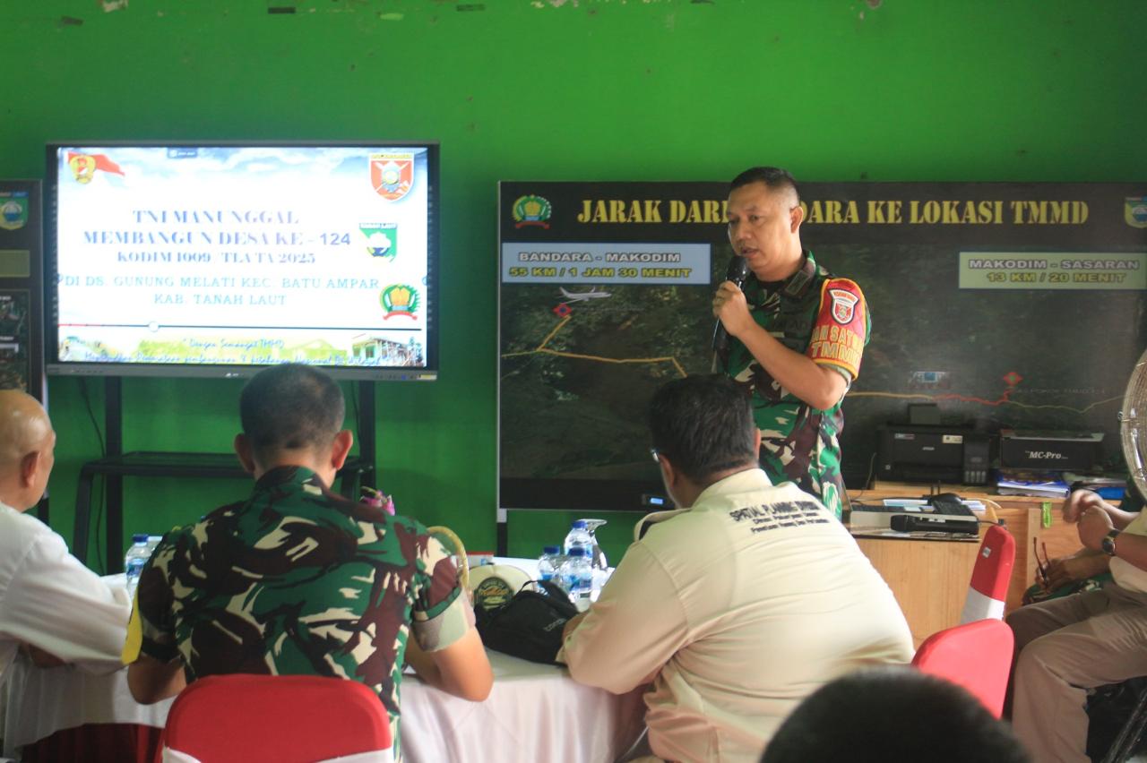 TANAH LAUT – Dandim 1009/Tanah Laut Letkol Inf Indar Irawan, S.E., M.Han., yang juga bertindak sebagai Dansatgas TMMD memaparkan perkembangan pelaksanaan program TNI Manunggal Membangun Desa (TMMD) ke-124 di wilayah Kodim 1009/Tla kepada Tim Wasev Mabesad, bertempat di Aula Kantor Desa Gunung Melati, Kec. Batu Ampar, Kab. Tanah Laut, Rabu (14/05/2025).