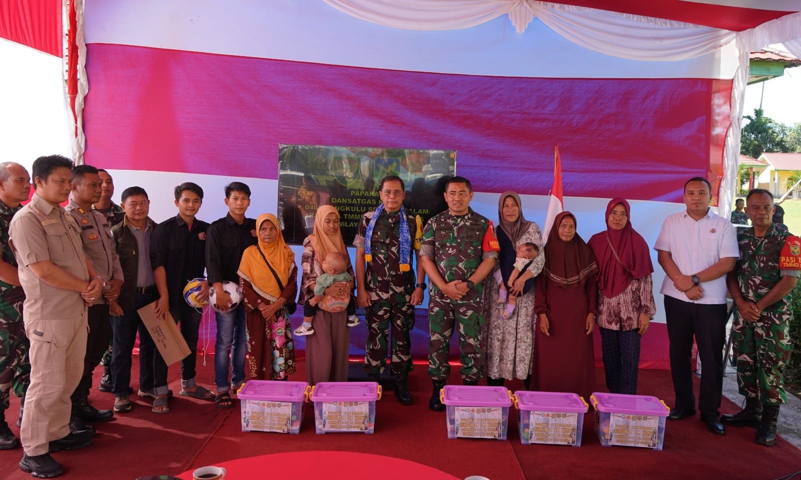 Kaur- Tim Pengawas dan Evaluasi (Wasev) membagikan bingkisan berupa paket sembako dan perlengkapan olahraga kepada warga di lokasi TNI Manunggal Membangun Desa (TMMD) ke-124 Kodim 0408/BS di Desa Bandu Agung, Kecamatan Kaur Utara,Kabupaten Kaur,Sabtu (17/5/25)