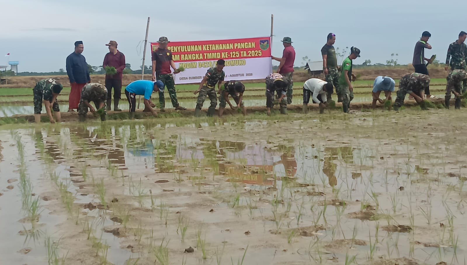 Mukomuko – Program TMMD Reguler ke-125 Kodim 0428/Mukomuko terus menunjukkan kiprah nyata dalam membantu masyarakat. Pada hari ke-28, Selasa (19/08/2025), Satgas bersama warga Desa Sumber Makmur, Kecamatan Lubuk Pinang, melaksanakan kegiatan penanaman padi sebagai bagian dari upaya mendukung ketahanan pangan di tingkat desa.