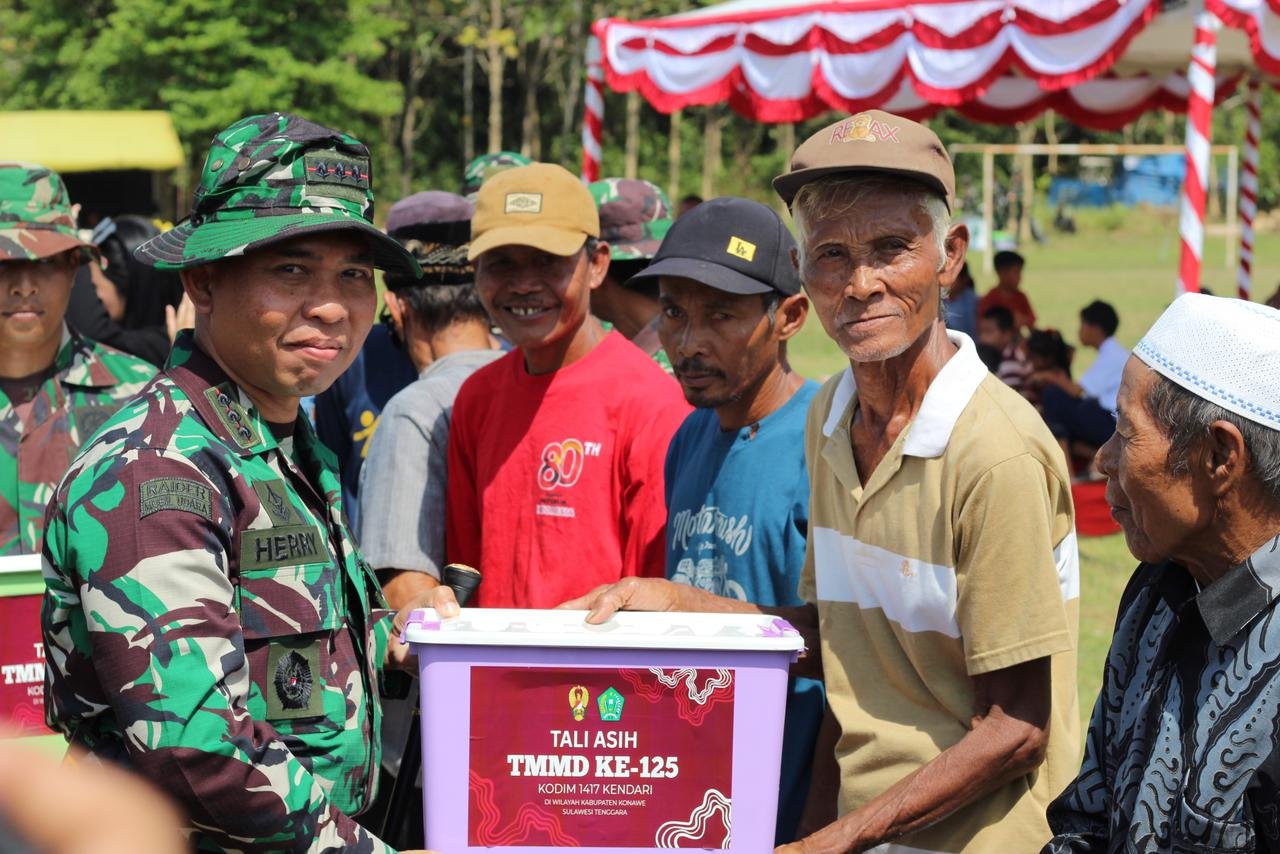 Konsel – Menandai berakhirnya pelaksanaan TNI Manunggal Membangun Desa (TMMD) ke-125 di Kecamatan Asinua, Kabupaten Konawe, Kodim 1417/Kendari menggelar kegiatan sosial berupa penyaluran 200 paket sembako kepada masyarakat kurang mampu, Kamis (21/8).