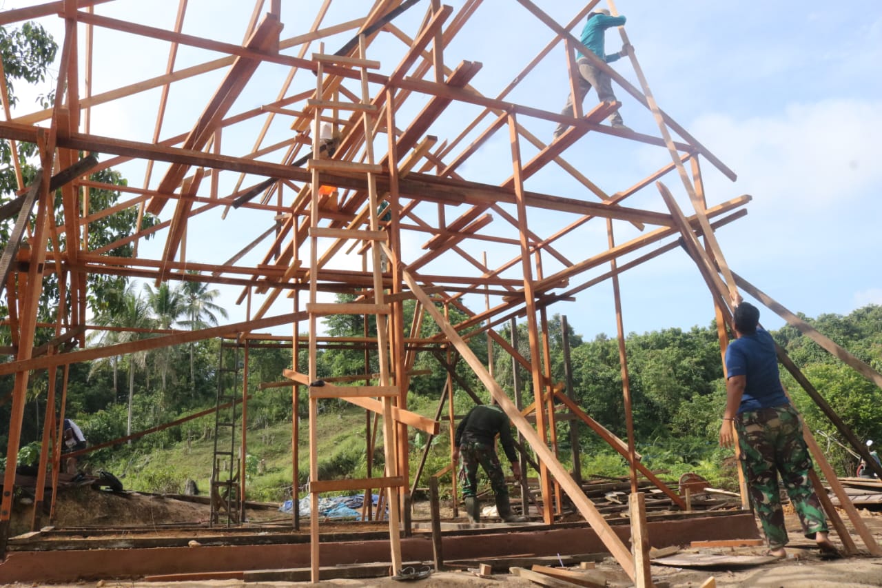 Suasana kebersamaan terpancar kuat saat anggota TNI dan warga bahu-membahu mengangkat dan memasang balok-balok kayu. Pemandangan ini bukan sekadar aktivitas konstruksi, melainkan cerminan nyata dari kemanunggalan yang menjadi jiwa dari setiap program TMMD. Rahman, pemilik rumah, tak dapat menyembunyikan rasa bahagianya.