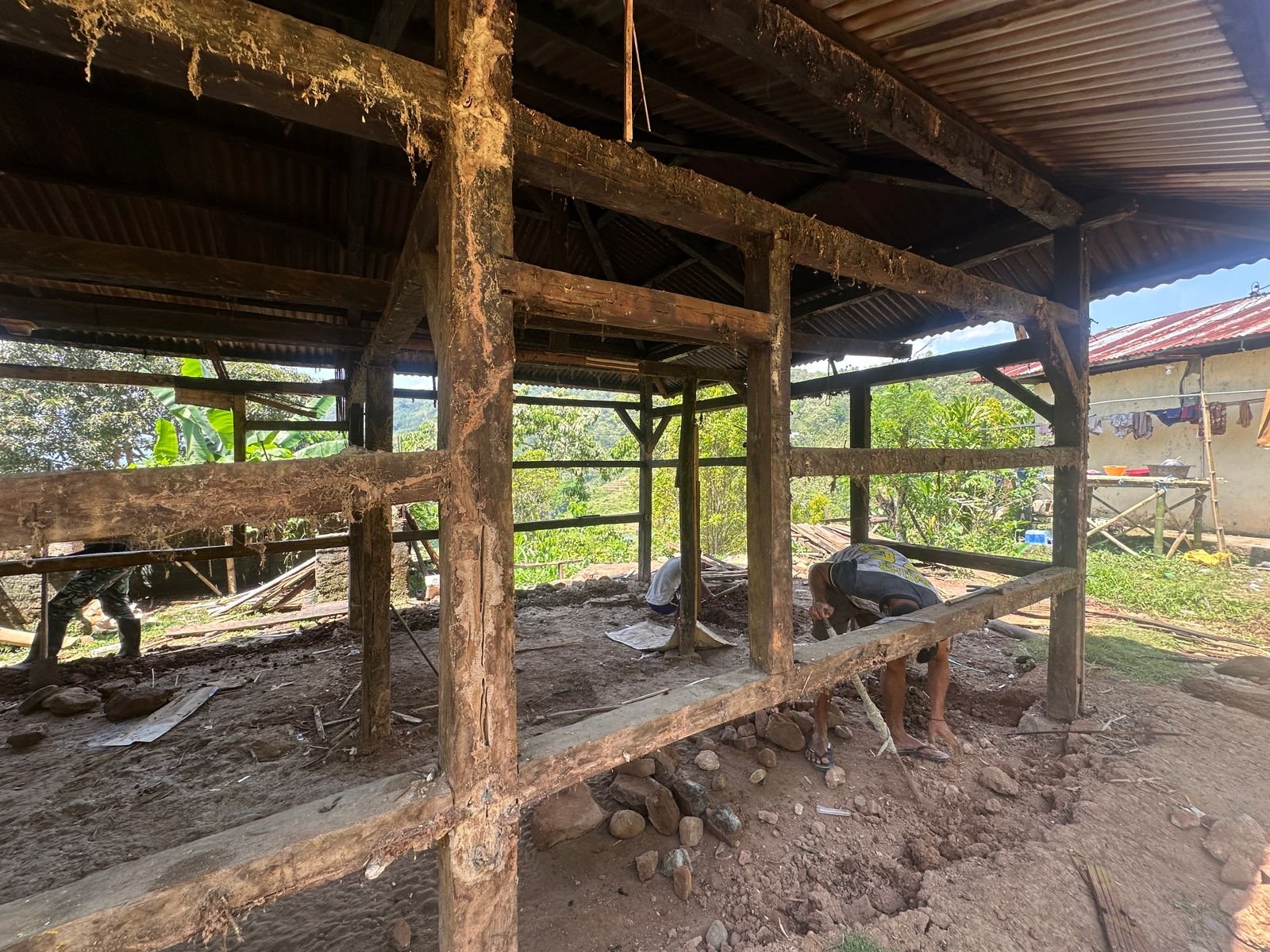 Dipimpin oleh Kopda Muhtar, personel TNI dan warga setempat bahu-membahu. Fokus kegiatan hari ini adalah pembongkaran bagian samping kiri dan kanan rumah warga penerima bantuan. Proses pengerjaan berjalan lancar, didorong oleh semangat kemanunggalan yang tak kenal lelah.