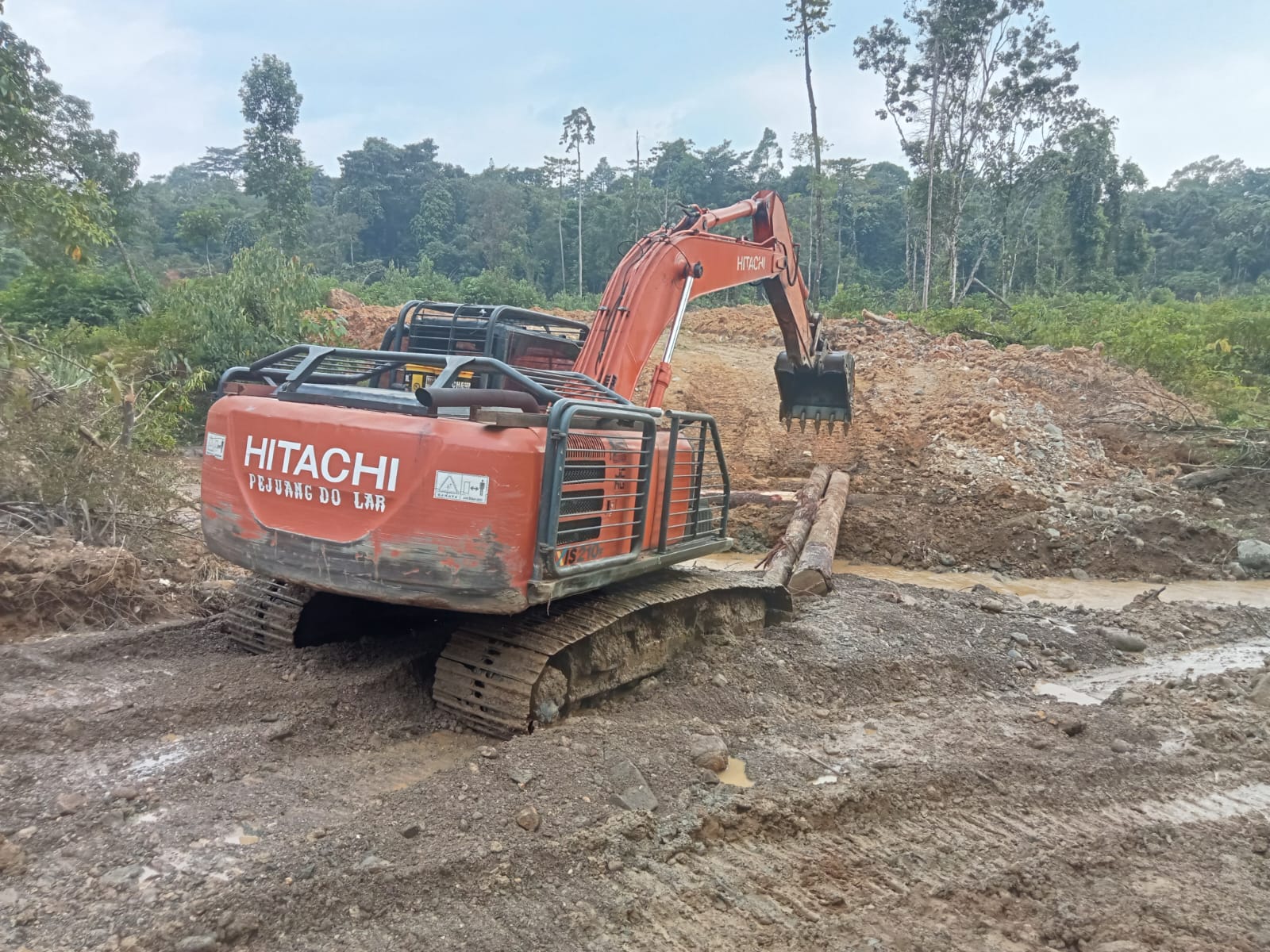 Di lokasi tersebut, sebuah excavator tampak bekerja di tepian aliran sungai kecil. Bucket besinya menggali tanah dan menata bebatuan untuk membentuk jalur yang akan menjadi tempat pemasangan gorong-gorong.