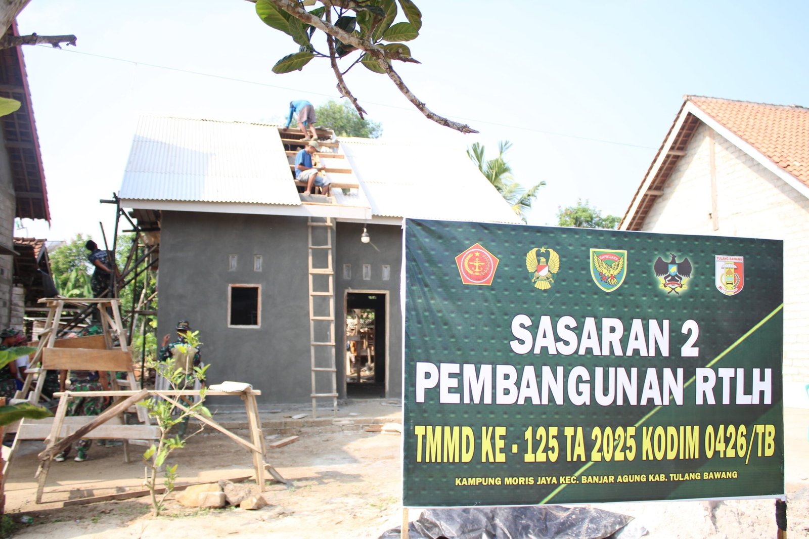 Tulang Bawang – Program TNI Manunggal Membangun Desa (TMMD) ke-125 Kodim 0426/Tulang Bawang terus berjalan dengan progres signifikan. Pada Kamis, 7 Agustus 2025, kegiatan fisik berupa pemasangan atap rumah dalam program Rumah Tidak Layak Huni (RTLH) dilaksanakan di sasaran 2, Kampung Moris Jaya, Kecamatan Banjar Agung, Kabupaten Tulang Bawang.