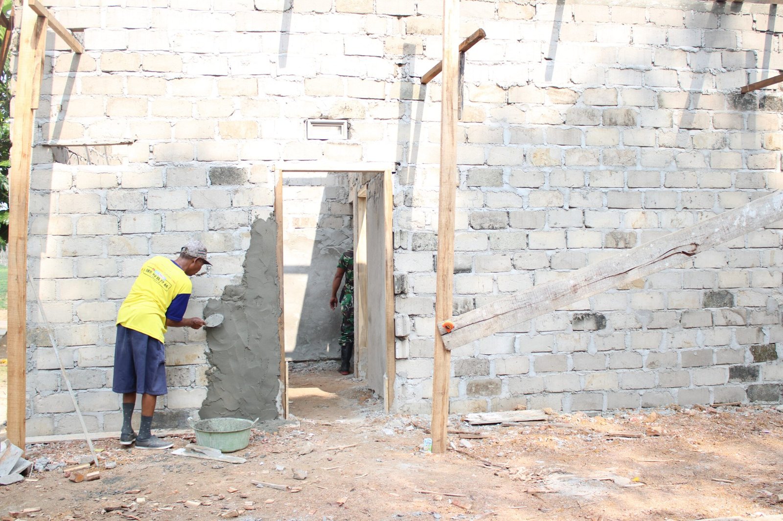 Pekerjaan yang dilakukan di lokasi tersebut meliputi tahap plester dinding sebagai bagian dari proses finishing bangunan. Kegiatan ini dilakukan secara bergotong-royong bersama masyarakat setempat yang turut aktif membantu jalannya pembangunan.