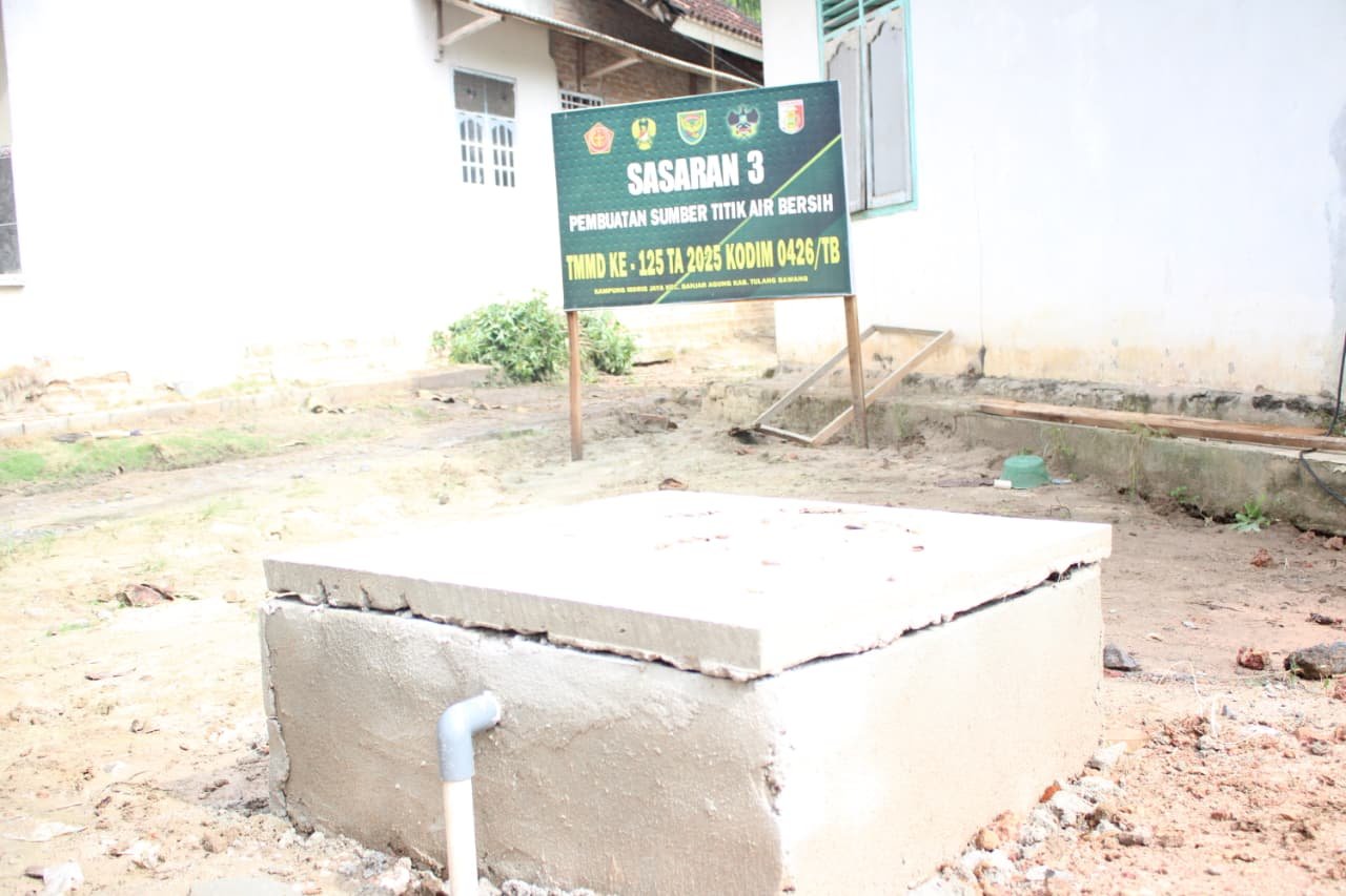 Tulang Bawang, 13 Agustus 2025 – Pekerjaan pembangunan sumur air bersih pada sasaran 3 TMMD ke-125 Kodim 0426/Tulang Bawang di Kampung Moris Jaya, Kecamatan Banjar Agung, telah rampung 100 persen. Fasilitas ini menjadi salah satu prioritas yang sangat dibutuhkan masyarakat setempat untuk memenuhi kebutuhan air bersih sehari-hari.