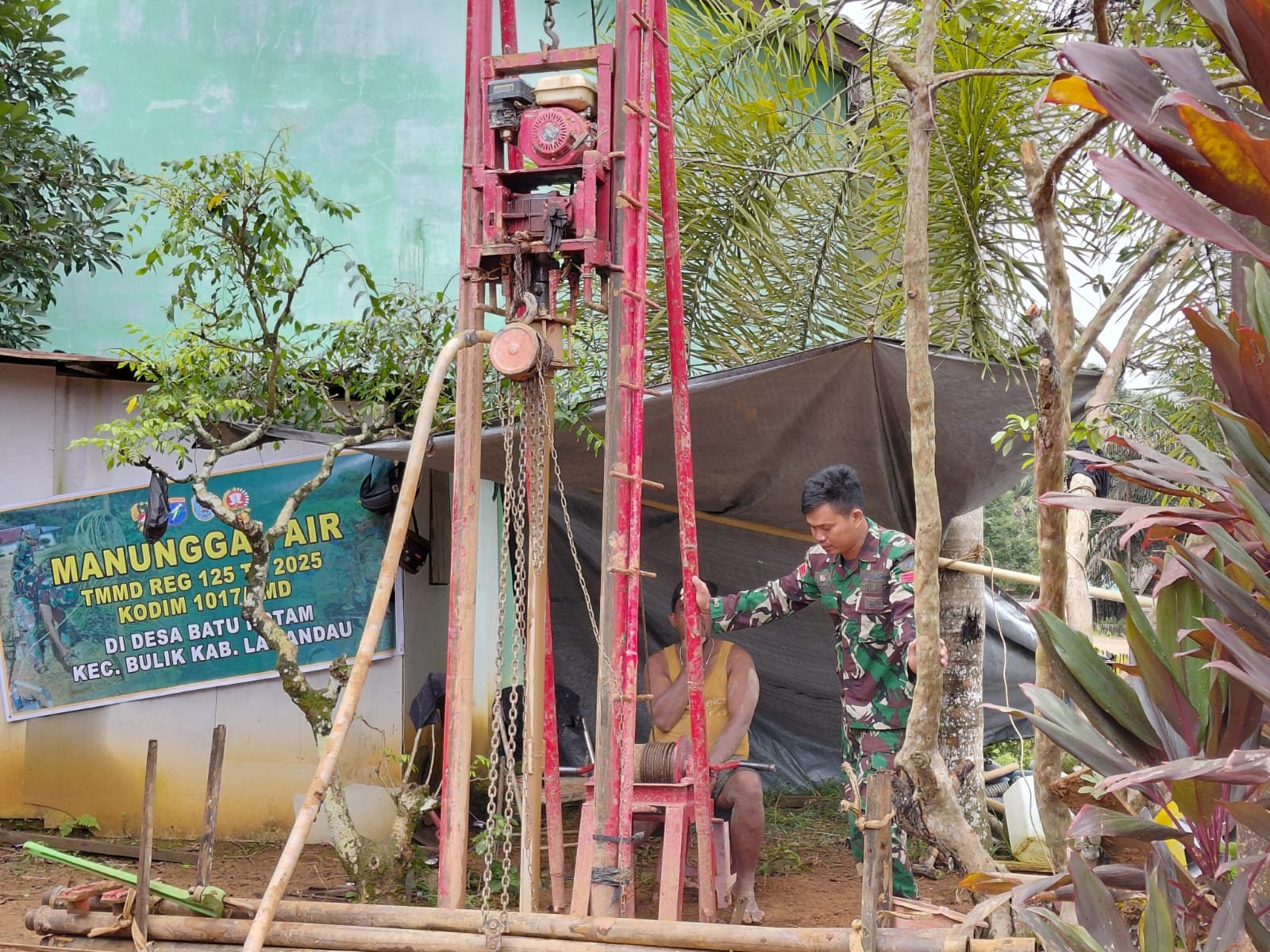 Lamandau – Pembangunan sumur bor ke-5 yang menjadi sasaran terakhir dalam program TNI Manunggal Membangun Desa (TMMD) Reguler ke-125 Kodim 1017/Lamandau di SDN Guci, RT 02, Kec. Bulik Kab. Lamandau Minggu (10/08/25). Kini telah mencapai 75 persen. Progres ini menunjukkan kerja keras personel TNI bersama masyarakat dalam memenuhi kebutuhan air bersih di wilayah tersebut.
