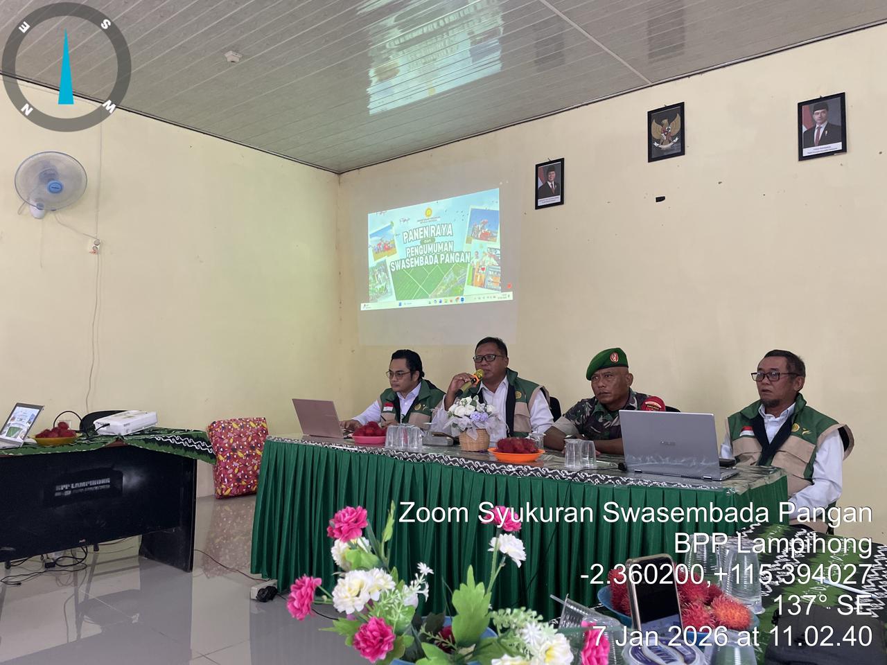 Balangan – Kegiatan Panen Raya dan pengumuman tercapainya Swasembada Pangan Nasional yang disampaikan langsung oleh Presiden Republik Indonesia melalui zoom meeting. Kegiatan tersebut berlangsung di Balai Pertanian Desa Batu Merah, Kecamatan Lampihong, Kabupaten Balangan. Pada hari Rabu (07/01/2026) pukul 09.00 WITA