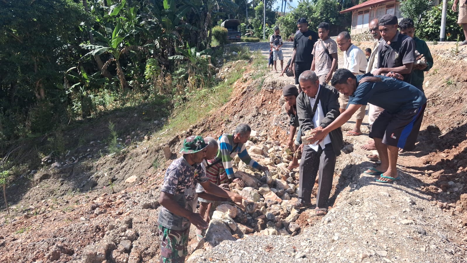 Pada Rabu pagi, 29 April 2026, Danramil Kapten Inf I Komang Wenten, bersama Babinsa, Bhabinkamtibmas dari Polsek KiE, serta masyarakat, melaksanakan karya bhakti untuk memperbaiki jalan raya yang terputus akibat longsor di RT 08 RW 04 Dusun II, Desa Nekmese.