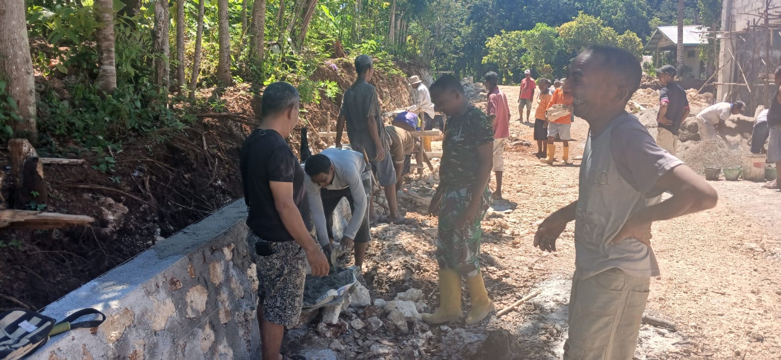 Selama pelaksanaan, tindakan gotong royong dilakukan oleh Babinsa dan warga dalam beberapa tahapan, mulai dari penggalian pondasi, penyusunan batu, hingga pengecoran tembok penahan. Semua aktivitas berjalan dengan antusias yang tinggi, menampilkan rasa kebersamaan serta tanggung jawab dari seluruh peserta yang terlibat.