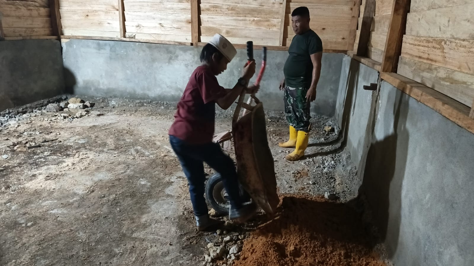 Dalam kondisi gelap, semangat baik prajurit TNI maupun warga tetap menyala, terlihat dari setiap ketukan palu dan pengaturan material bangunan yang dilakukan dengan penuh dedikasi. Situasi ini mencerminkan eratnya hubungan dan kemanunggalan antara TNI dan rakyat yang berupaya bersama demi kesejahteraan komunitas.