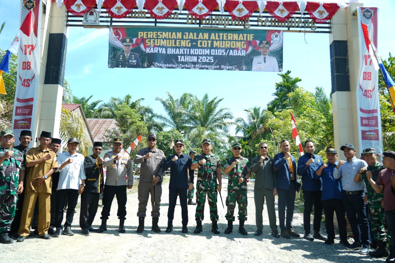 Aceh Barat — Kolaborasi TNI bersama Forkopimda Kabupaten Aceh Barat berhasil menyelesaikan pembangunan jalan alternatif sepanjang 6 kilometer yang menghubungkan Desa Seumuleng, Kecamatan Bubon, dengan Desa Cot Murong, Kecamatan Woyla Induk. Peresmian jalan ini sekaligus menjadi penanda berakhirnya kegiatan Karya Bhakti yang melibatkan sinergi antara TNI, pemerintah daerah, dan masyarakat setempat, Senin (18/8/2025).