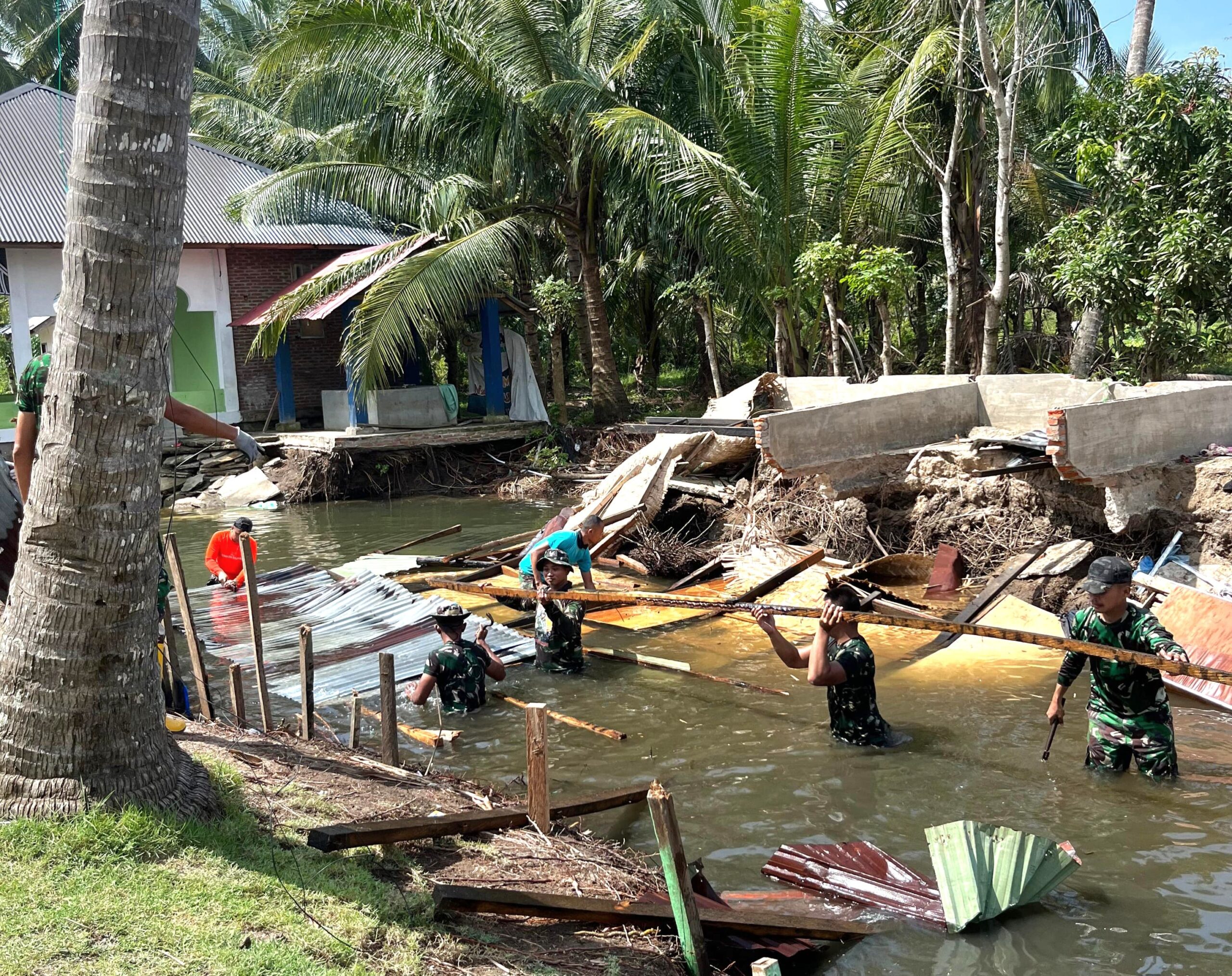 Dengan semangat gotong royong, prajurit TNI bersama masyarakat setempat bekerja keras mengangkat puing-puing, lembaran seng, dan batang pohon kelapa yang tersisa. Menurut Serka Joko Susilo, Babinsa Desa Bluka Teubai, pembersihan ini adalah bagian dari upaya pemulihan pasca bencana. Ia menyatakan, “Kami berkomitmen agar balai pengajian ini segera bersih dan kembali dapat dipergunakan oleh masyarakat.”
