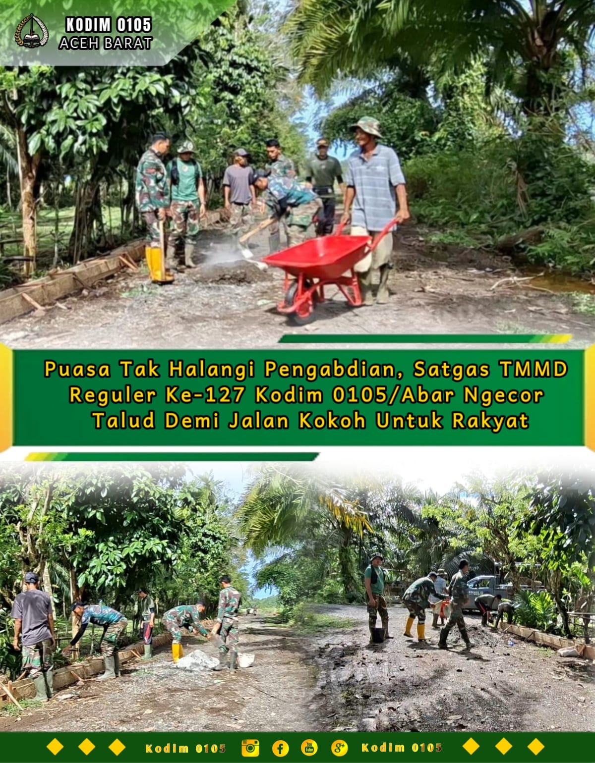ACEH BARAT – Semangat ibadah dan pengabdian menyatu dalam diri personel Satgas TMMD Reguler Ke-127 Kodim 0105/Abar yang terus melanjutkan pekerjaan sasaran fisik pembuatan Talud Penahan Timbunan (TPT) di Desa Pasi Aceh, Kecamatan Woyla, Kamis (19/02/2026).