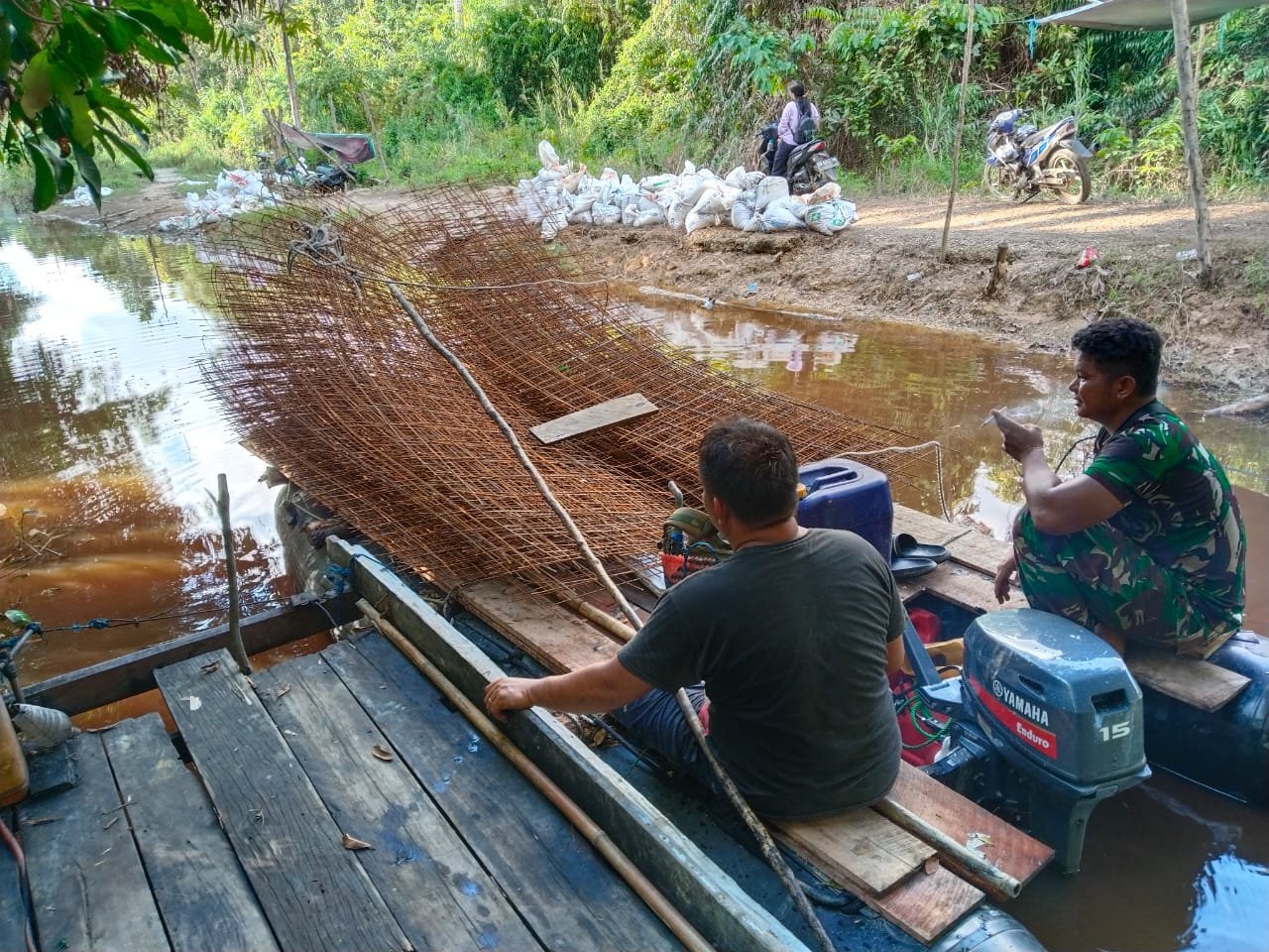 Dengan medan yang masih sulit dilalui kendaraan berat, anggota Satgas TMMD bersama warga secara manual mengangkut besi-besi rangka dari titik penurunan material menuju lokasi pengecoran. Besi tersebut akan digunakan sebagai tulangan dalam pembangunan jalan rabat beton sepanjang satu kilometer.