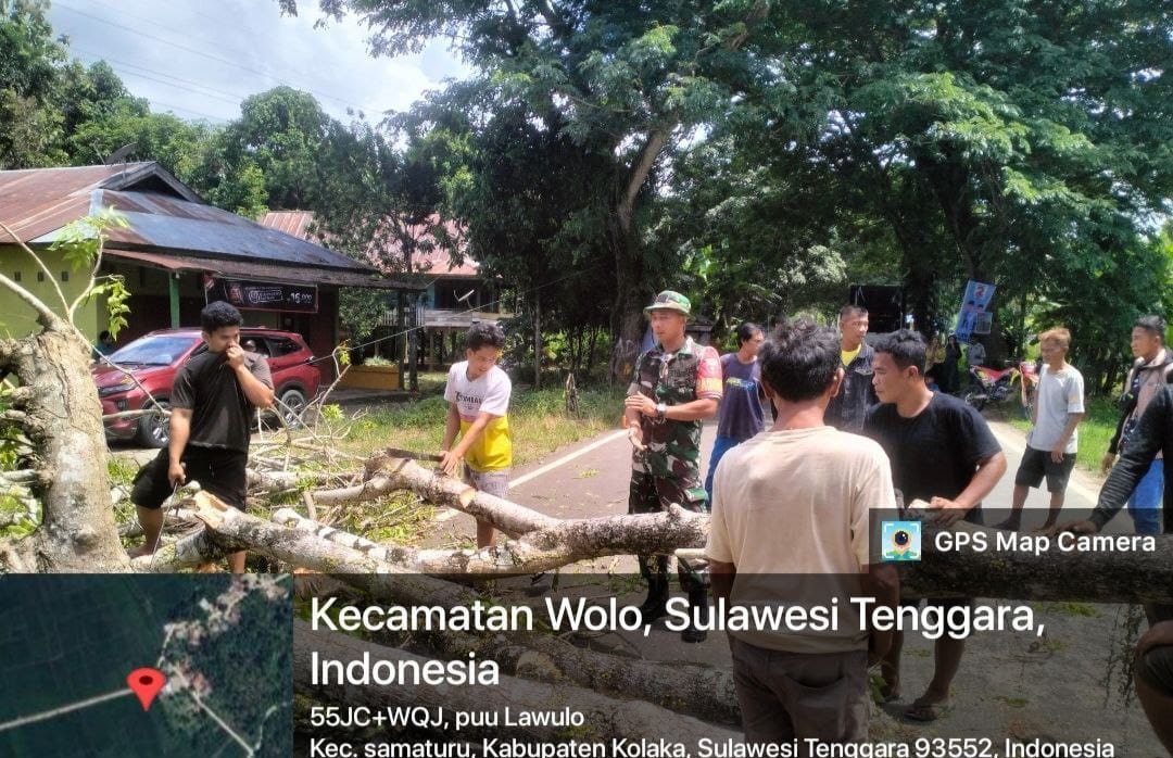 Kolaka – Pada hari Minggu, 11 Januari 2026, Sertu Arfah, Babinsa dari Koramil 1412-04/Kolaka, dengan semangat gotong royong, berkolaborasi dengan warga Desa Puu Lawulo, Kecamatan Samaturu, Kabupaten Kolaka untuk membersihkan sebuah pohon besar yang tumbang dan menghalangi jalan poros penting. Kejadian ini terjadi setelah hujan deras yang melanda wilayah tersebut, menyebabkan beberapa pohon tumbang dan memblokir akses lalu lintas.