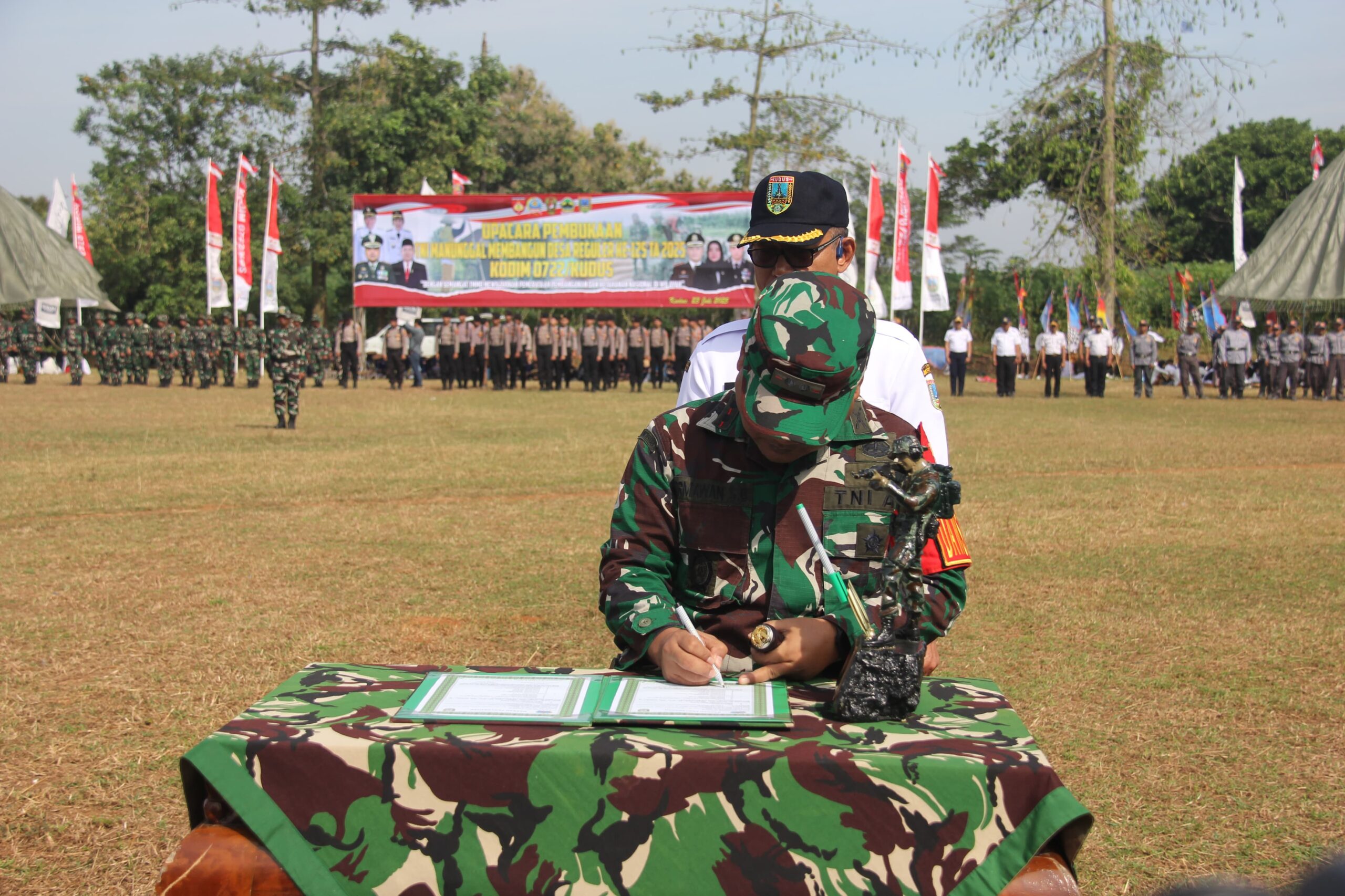 KUDUS – Di bawah bentangan langit yang menjadi saksi bisu pergerakan kemajuan yang tak terhindarkan, Kabupaten Kudus, sebuah wilayah yang kaya akan sejarah dan potensi, kembali mengukir jejak pembangunan yang monumental. Rabu (23/07), telah ditakdirkan menjadi momentum bersejarah yang tak terlupakan tatkala Program TNI Manunggal Membangun Desa (TMMD) Ke-125, sebuah inisiatif kolaboratif yang sangat dinanti, secara resmi dinyatakan dibuka di Lapangan Desa Kedungmas, yang berlokasi di Kecamatan Dawe.