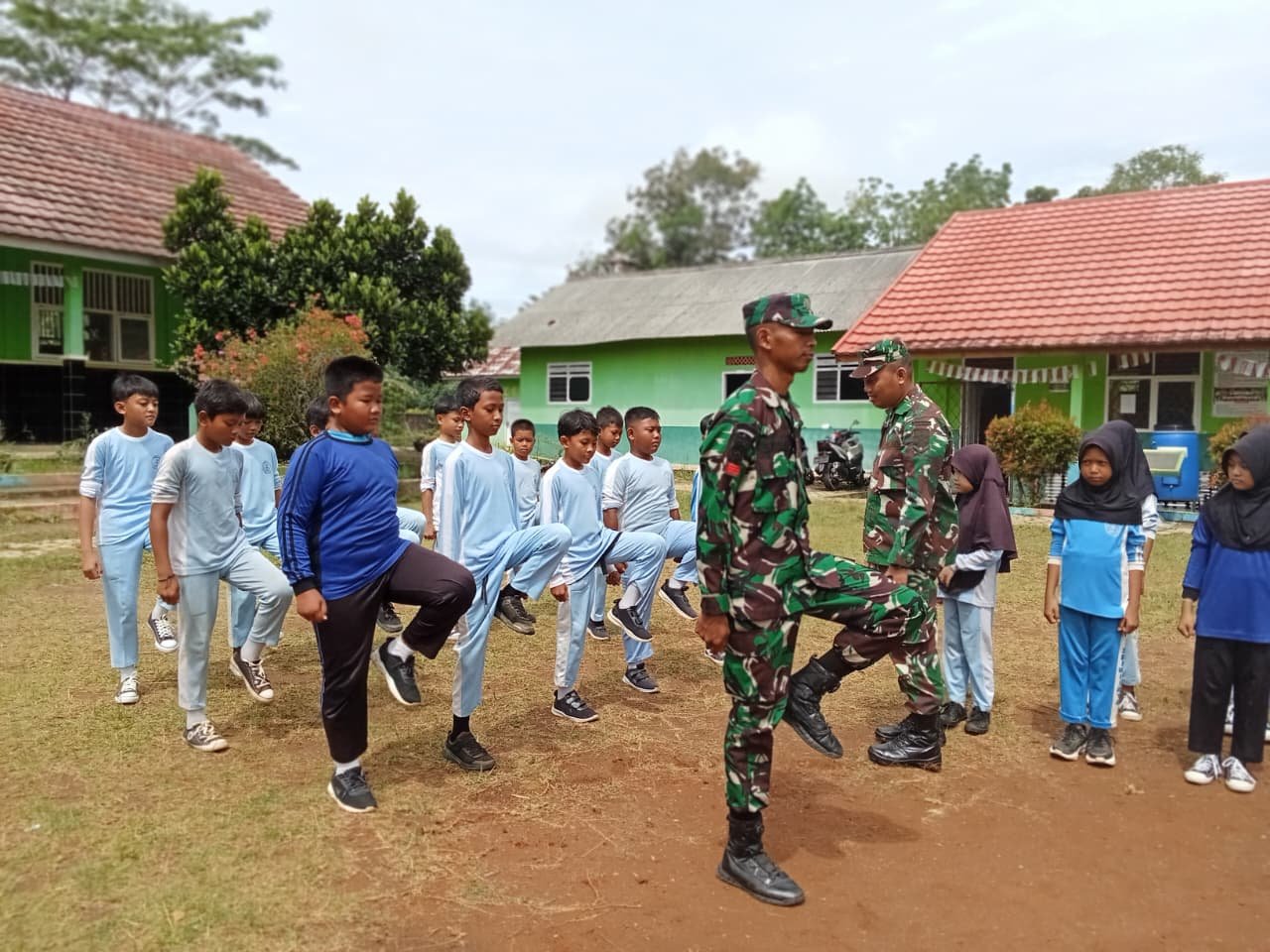 Dipimpin langsung oleh anggota Satgas TMMD, latihan berlangsung penuh semangat. Para siswa tampak antusias mengikuti setiap aba-aba dengan tertib dan kompak.