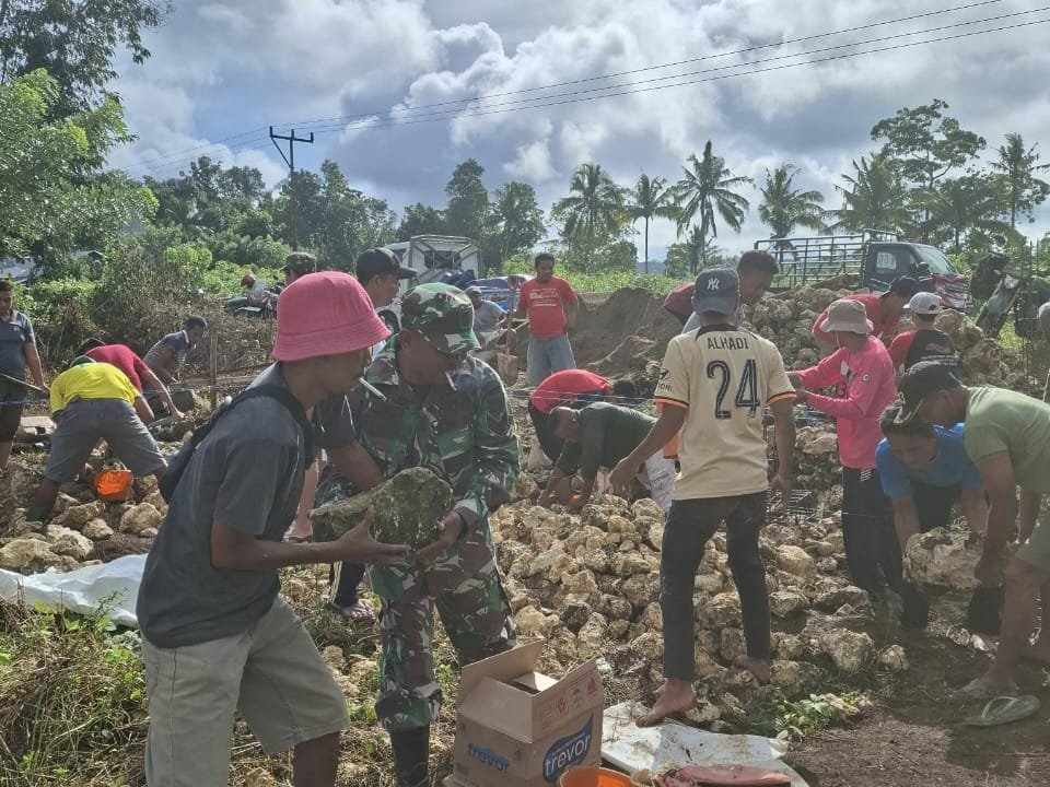 SUMBA TENGAH – Dalam upaya menumbuhkan semangat kebersamaan dan mempererat hubungan dengan masyarakat, Babinsa Koramil 03/Katikutana Kodim 1613/Sumba Barat, Serka Safrudin, bersama warga melaksanakan kegiatan gotong royong membangun pondasi rumah milik salah satu warga di Desa Makatakeri, Kecamatan Katikutana, Kabupaten Sumba Tengah, Jumat (18/7/2025).