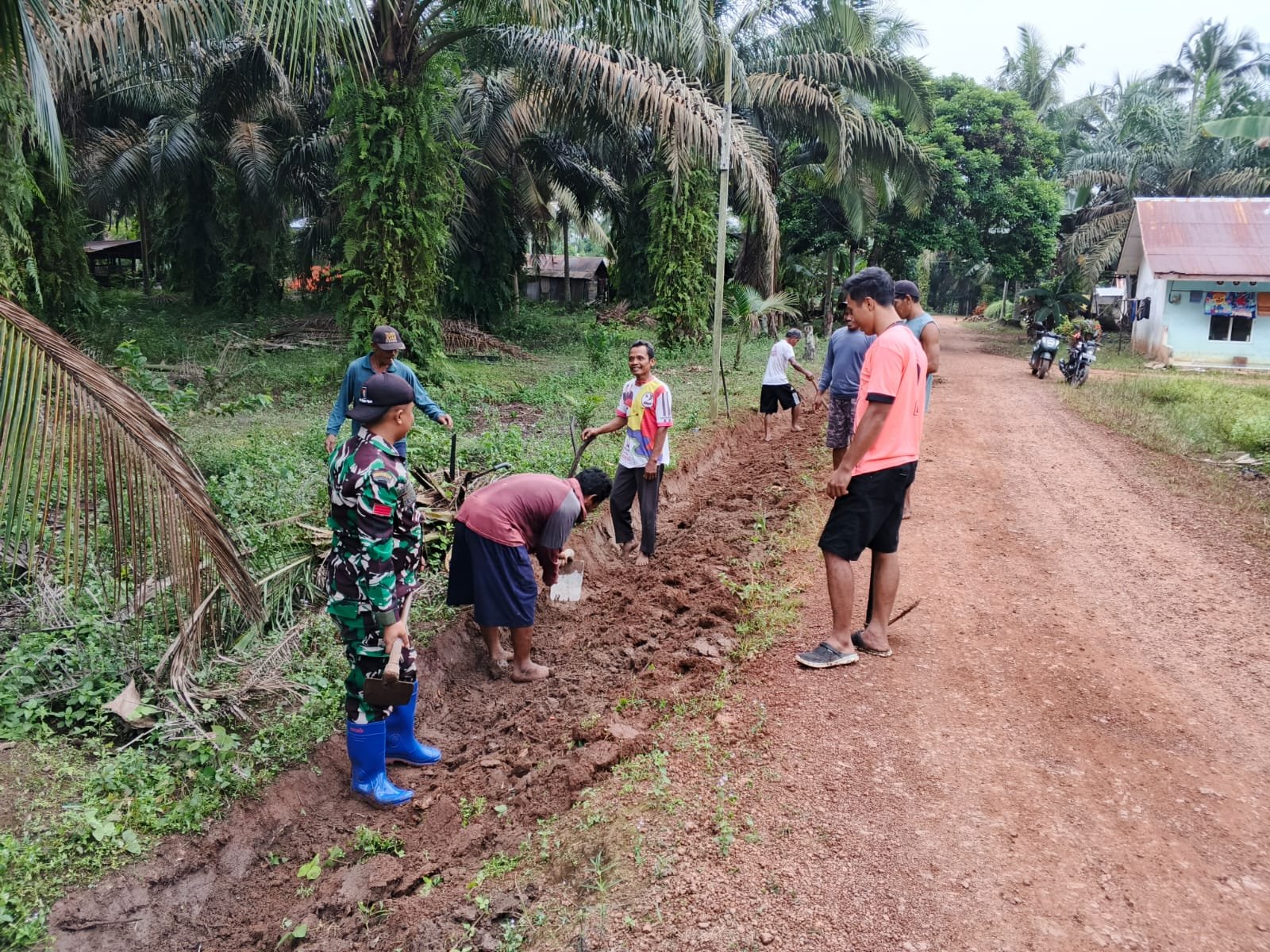 Kotawaringin Timur – Babinsa Koramil 1015-07/Parenggean Praka Teguh, tampak semangat melaksanakan gotong royong bersama warga masyarakat membersihkan semak belukar dan membuat parit di Desa Sari Harapan Kecamatan Parenggean, Kabupaten Kotawaringin Timur, Minggu (09/11/2025)