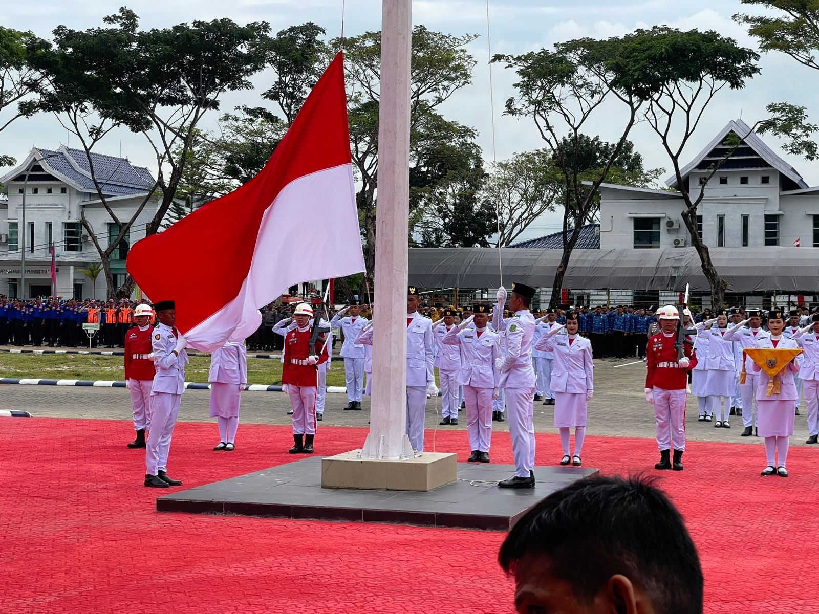 Momen sakral pengibaran Sang Merah Putih Oleh Pasukan Pengibar bendera Pusaka( Paskibraka )berlangsung lancar dan disertai lagu kebangsaan “Indonesia Raya” yang dinyanyikan penuh semangat.