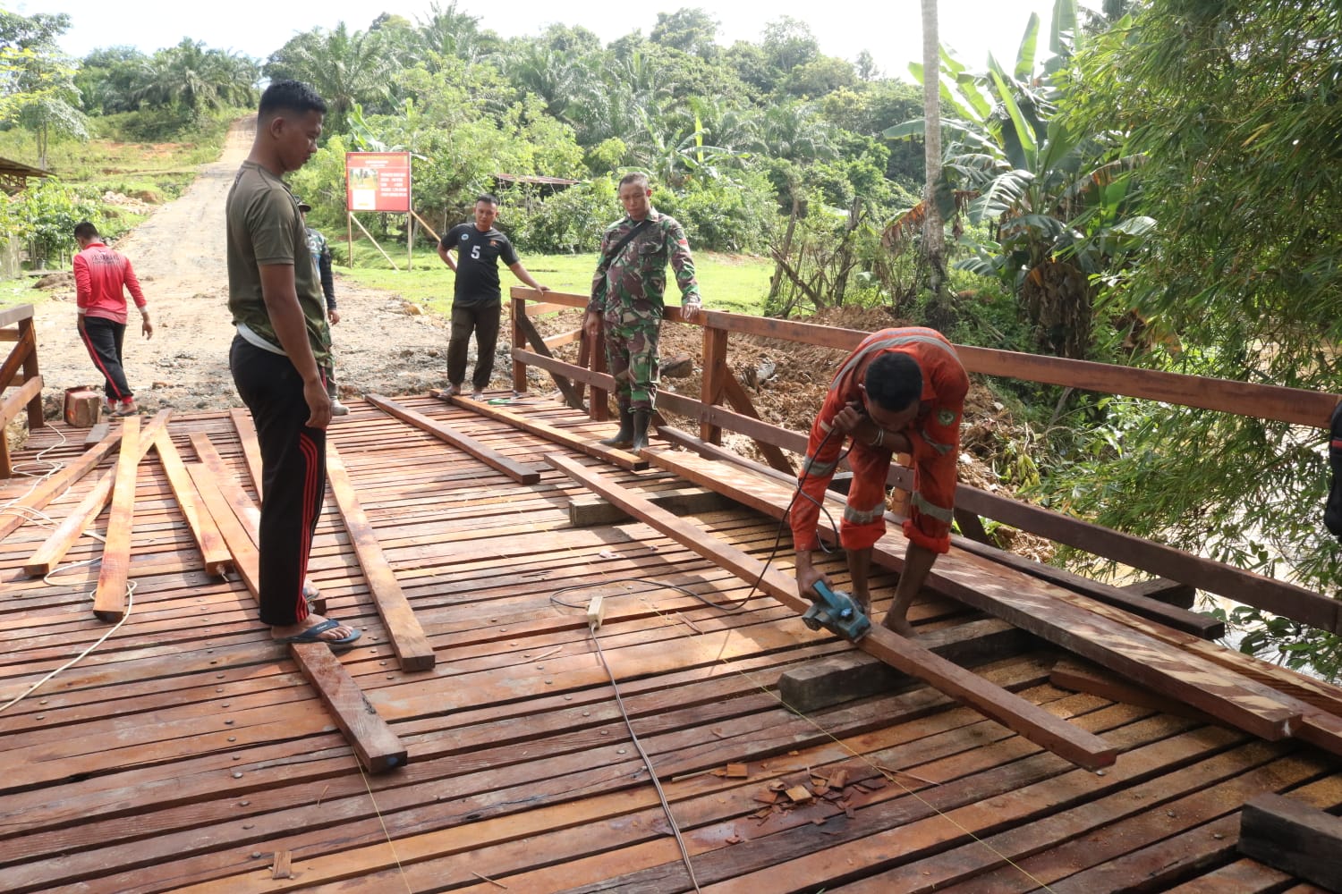 KUTAI TIMUR – Pembangunan jembatan kayu ulin yang menjadi salah satu sasaran fisik pada program TNI Manunggal Membangun Desa (TMMD) Ke-125 Kodim 0909/Kutai Timur kini memasuki tahap akhir. Anggota Satgas bersama warga Desa Suka Rahmat, Kecamatan Teluk Pandan, terus bekerja keras di bawah terik matahari untuk merampungkan pemasangan lantai jembatan.