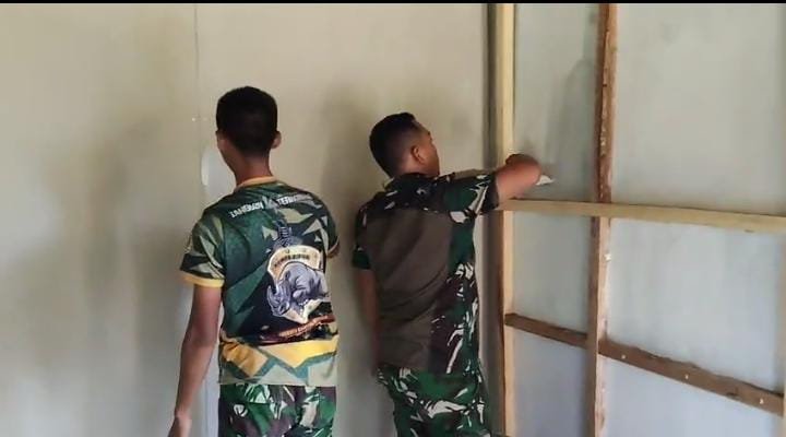 Personel Satgas TMMD bersama warga bekerja sama meratakan cat pada seluruh dinding rumah. Proses ini dilakukan dengan teliti agar hasilnya rapi dan indah dipandang.