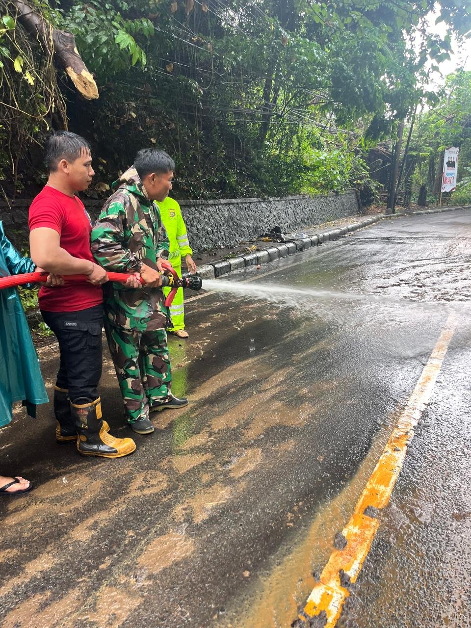 Tampak di lokasi, bersinergi bersama Polsek Banjarangkan dan BPBD Kabupaten Klungkung bahu membahu melaksanakan pembersihan dan evakuasi material longsor yang berserakan menutupi setengah badan jalan yang mengakibatkan arus lalu lintas macet.