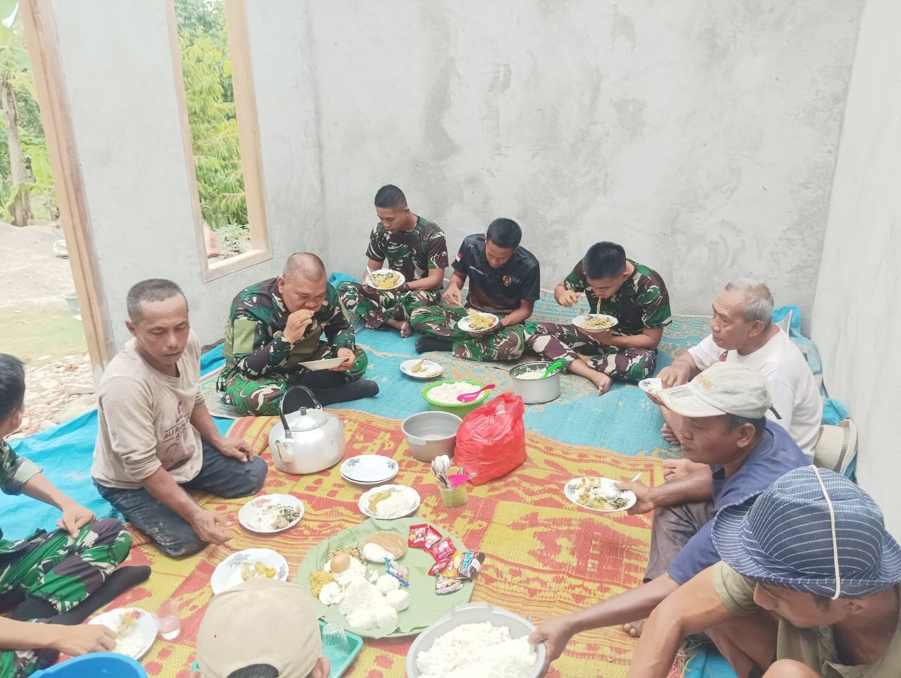 Dalam suasana sederhana namun penuh makna, anggota Satgas TMMD dan warga duduk bersama menikmati hidangan yang disiapkan oleh masyarakat sekitar. Kegiatan ini menjadi simbol rasa syukur sekaligus bentuk kebersamaan antara TNI dan rakyat.