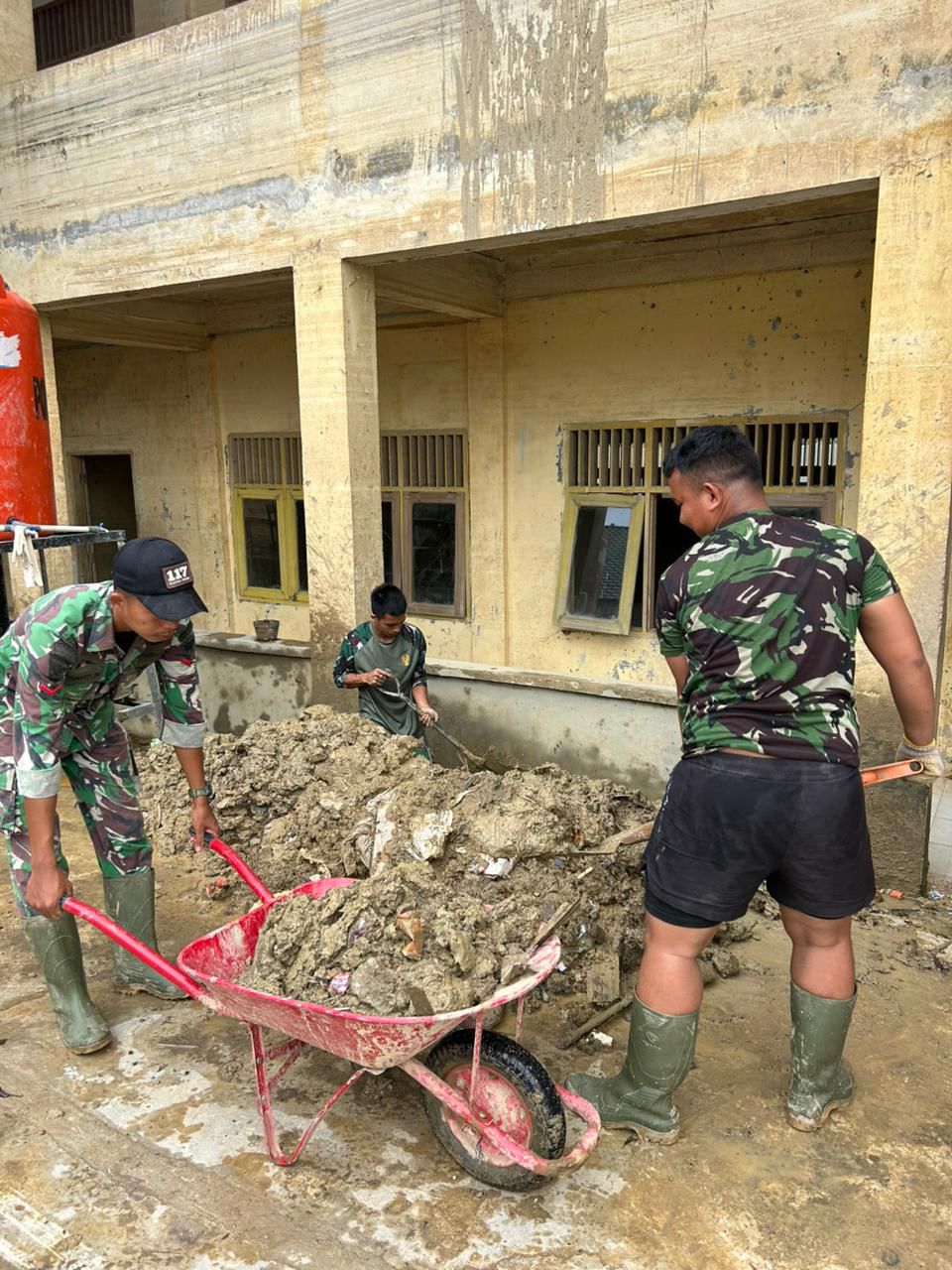 Personel TNI bersama masyarakat setempat bergotong royong membersihkan material lumpur, sampah, dan puing-puing yang mengganggu proses belajar mengajar serta pelayanan publik. Sejumlah sekolah, rumah ibadah, dan fasilitas umum lainnya menjadi sasaran utama kegiatan karya bakti tersebut.